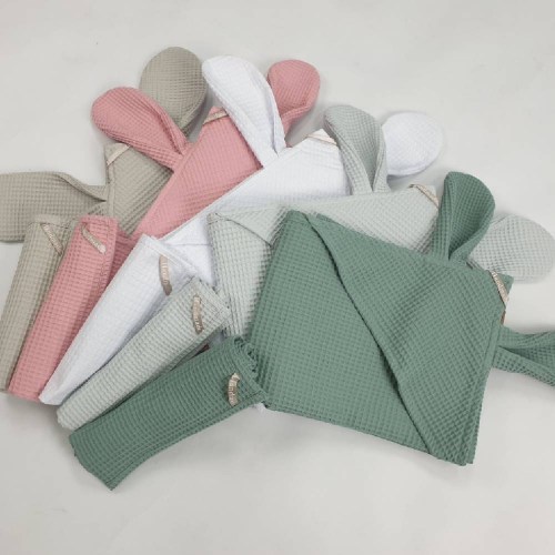 Ręcznik 100x100 cm z kapturkiem przyozdobiony uszkami króliczka , wykonany z miękkiej tkaniny bawełnianej Wafel. Tkanina przepuszcza powietrze, a wiec pozwala ona oddychać. Idealna dla alergików. Posiada większą chłonność i szybciej wysycha + myjka 50x50 cm. Również wszyta jest wstążeczka na której można powiesić go w dowolnym miejscu. Ręczniczek staje się delikatniejszy i miększy po pierwszym praniu. Możliwa kurczliwość do 10%.